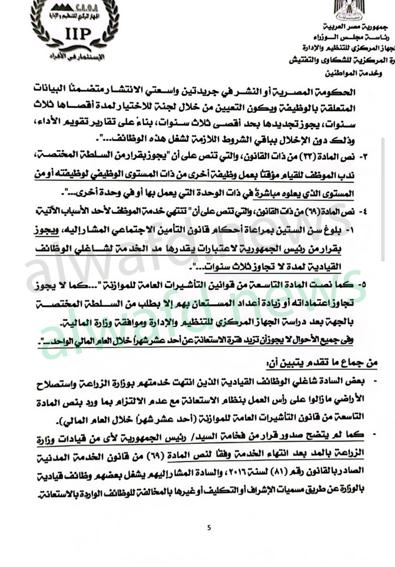 وشدد الجهاز المركزي للتنظيم والإدارة على ضرورة الالتزام الكامل بنصوص القانون، ووقف الاستعانة بالقيادات بعد بلوغهم سن التقاعد إلا في الحدود التي يجيزها القانون وبموافقات مكتملة، مع إتاحة الوظائف القيادية للشباب المؤهل من خلال مسابقات علنية تضمن الشفافية وتكافؤ الفرص.
