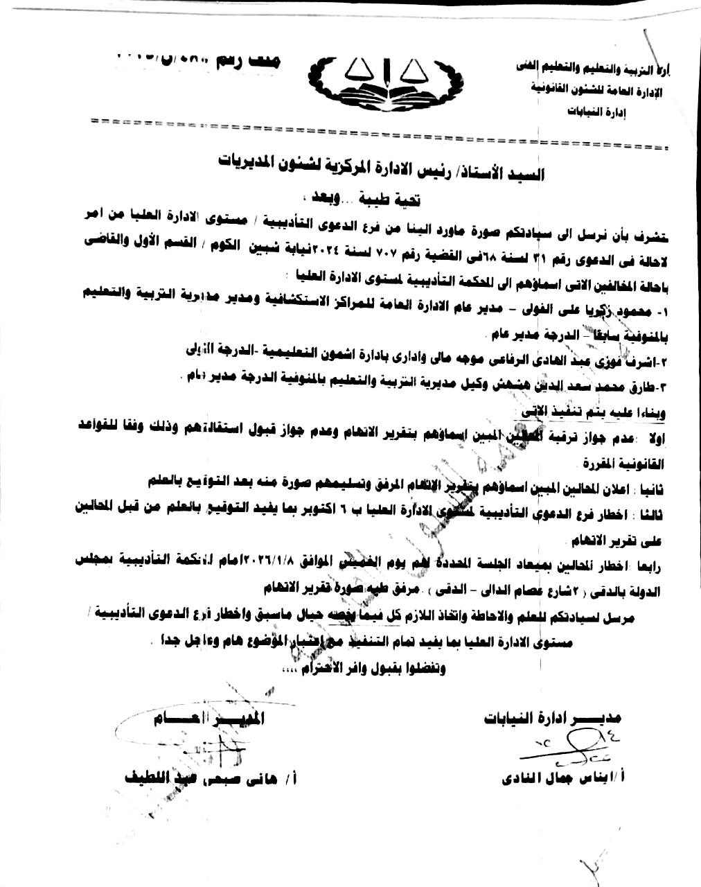 تضمن أمر إحالة وكيل وزارة التربية والتعليم والتعليم الفنى بمحافظة قــنا الجديد؛ في الدعوى رقم 31 لسنة 68 في القضية رقم 707 لسنة 2024 بنيابة شبين الكوم الإدارية(القسم الأول) إبان شغله منصب وكيل مديرية التربية والتعليم والتعليم الفنى بمحافظة المنوفية؛ عدم جواز ترقيته وقبول استقالته تنفيذاً للقواعد القانونية المقررة.