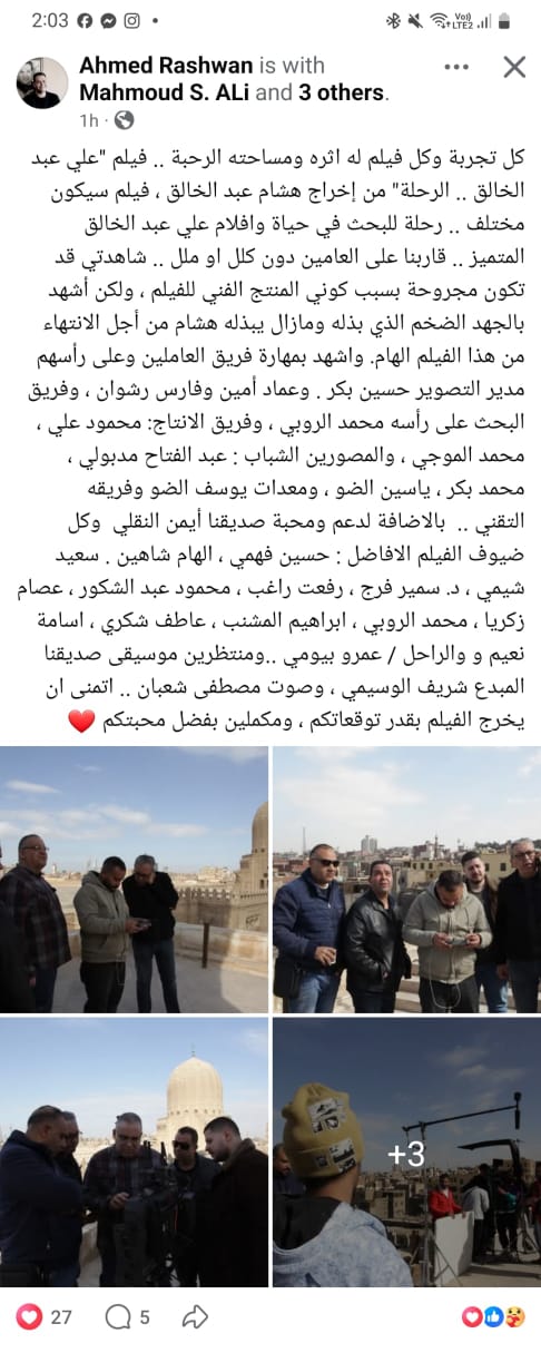 نشر المخرج السينمائي أحمد رشوان عبر صفحته الرسمية على فيسبوك منشورًا كشف فيه تفاصيل فيلم "علي عبد الخالق .. الرحلة"، الذي أخرجه هشام عبد الخالق.