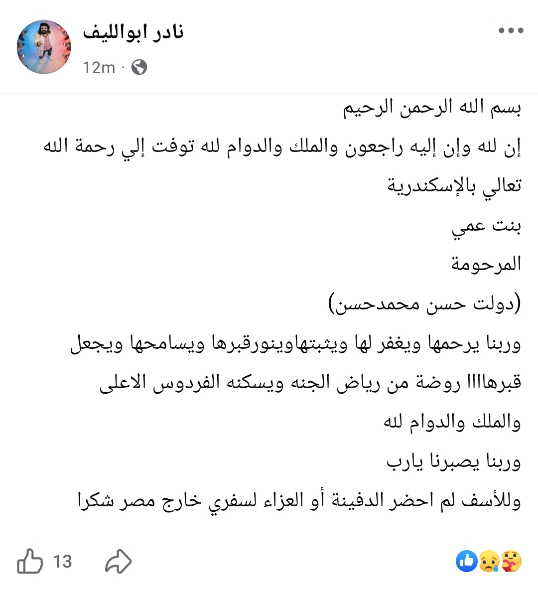 ونشر أبو الليف عبر حسابه الرسمي على فيسبوك كلمات مؤثرة يعبر فيها عن حزنه العميق لفقدان قريبة عزيزة، متمنياً لها المغفرة والرحمة، وأن يجعل قبرها روضة من رياض الجنة.
