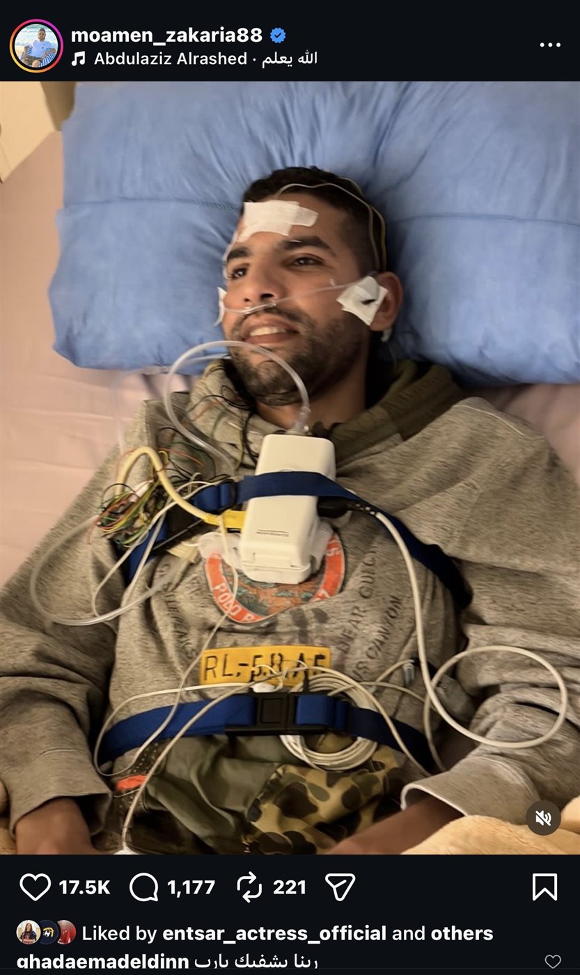 نشر اللاعب مؤمن زكريا صورة مؤثرة من أحدث ظهور له داخل المستشفى وهو يتلقى العلاج، موصولًا بعدد كبير من الأجهزة، ما عكس تدهور حالته الصحية وأثار حزن وقلق جمهوره ومحبيه داعيين له بالشفاء العاجل، وذلك عبر حسابه الشخصي بموقع تبادل الصور والفيديوهات “انستجرام”.