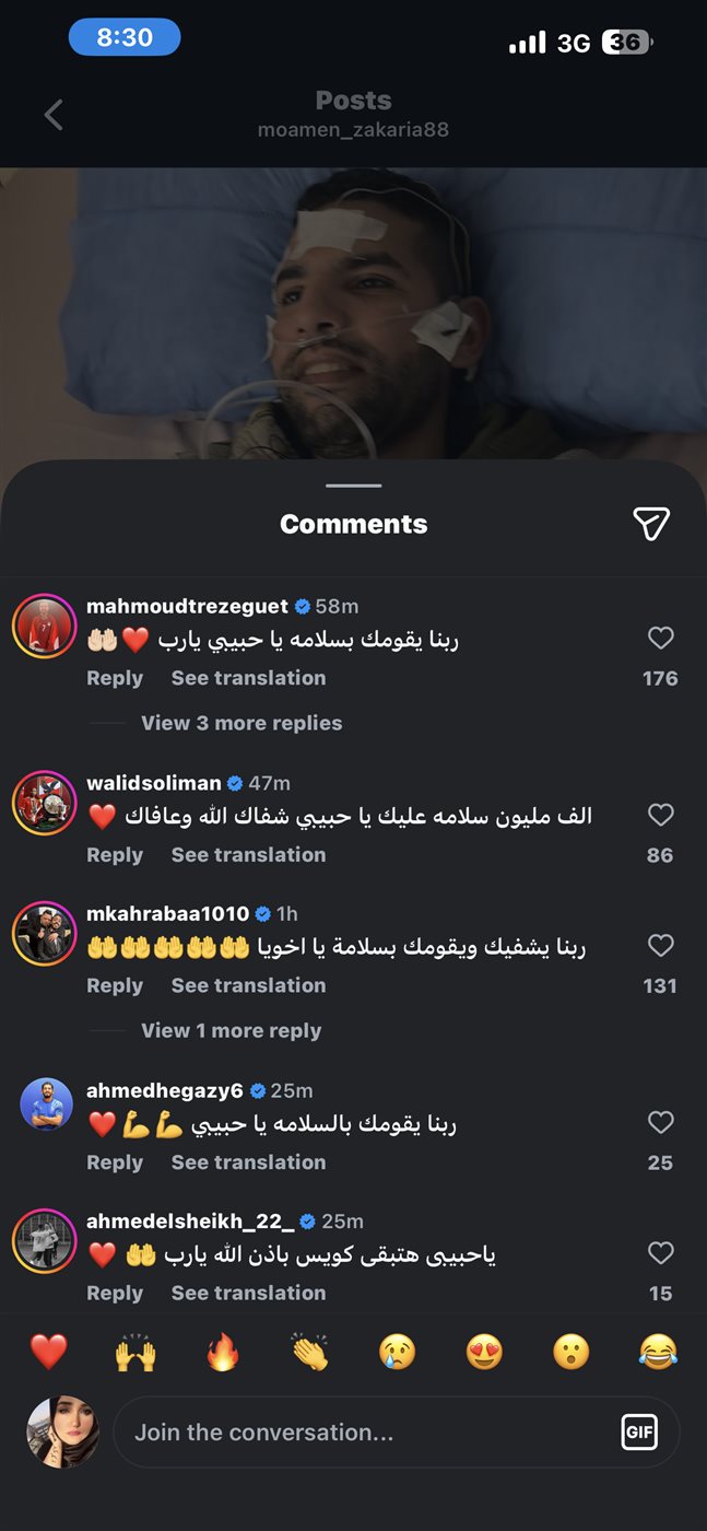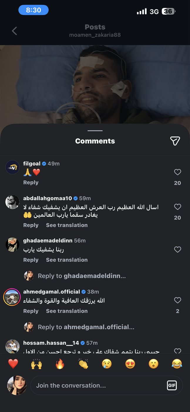 لاعبو كرة القدم يدعون بالشفاء العاجل للاعب مؤمن زكريا