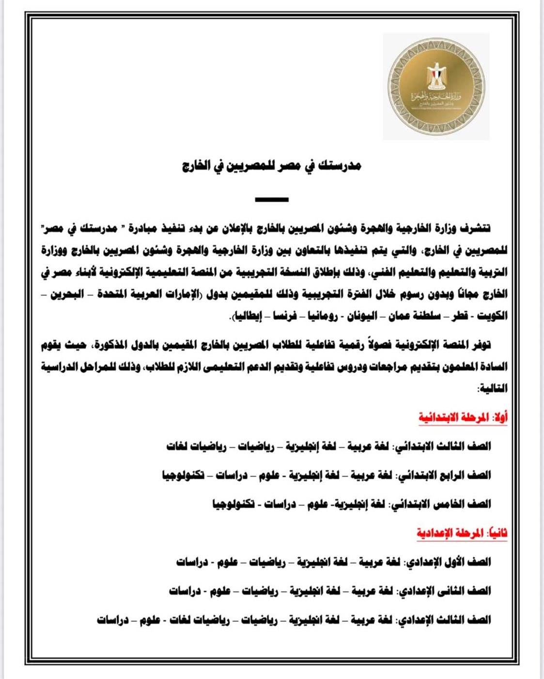 الخارجية تطلق النسخة التجريبية المجانية لمنصة «مدرستك في مصر» لأبناء المصريين بالخارج.. رابط