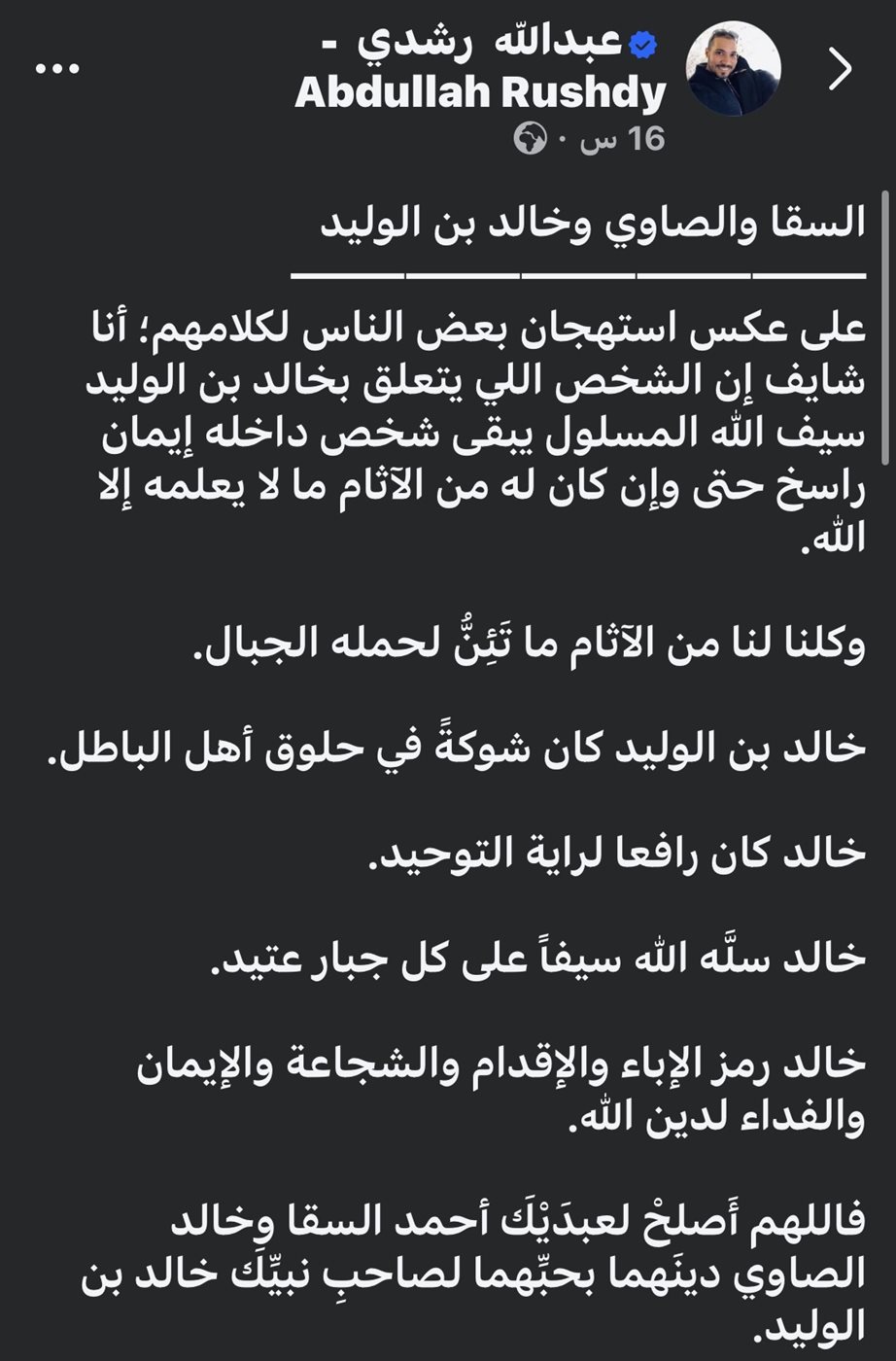 وأوضح عبدالله رشدي عبر حسابه الرسمي على موقع «فيسبوك» أنه لا يرى في هذا الأمر ما يستدعي الاستهجان، مشيرًا إلى أن من يحب خالد بن الوليد، سيف الله المسلول، يكون في داخله قدر كبير من الإيمان، حتى وإن كان يحمل من الذنوب ما لا يعلمه إلا الله، مؤكدًا أن جميع البشر لديهم أخطاء وآثام تثقل كواهلهم.
