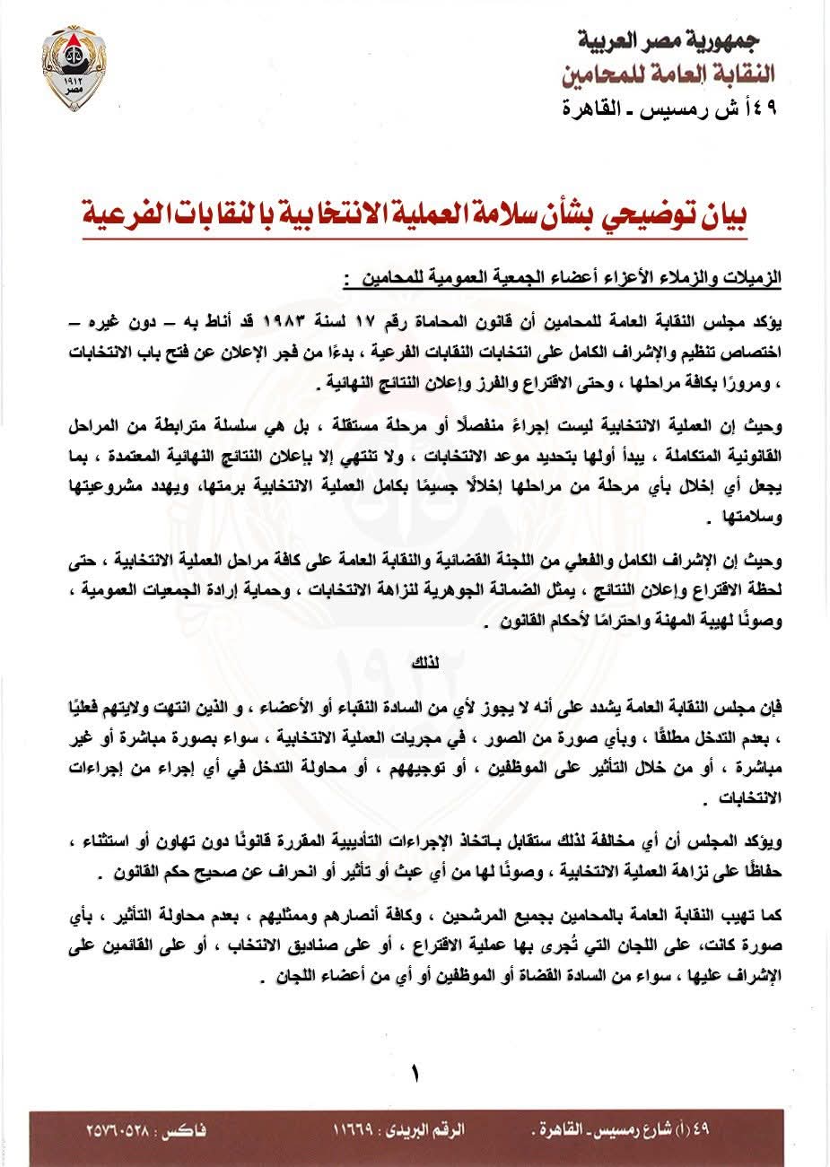 مجلس نقابة المحامين يصدر بيانَا بشأن سلامة العملية الانتخابية بالنقابات الفرعية
