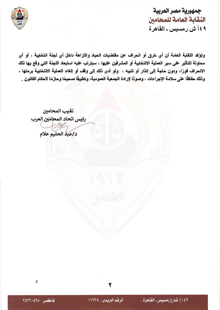 أصدر مجلس نقابة المحامين، برئاسة الدكتور عبد الحليم علام، نقيب المحامين ـ رئيس اتحاد المحامين العرب، بيانًا توضيحيَا بشأن سلامة العملية الانتخابية بالنقابات الفرعية.