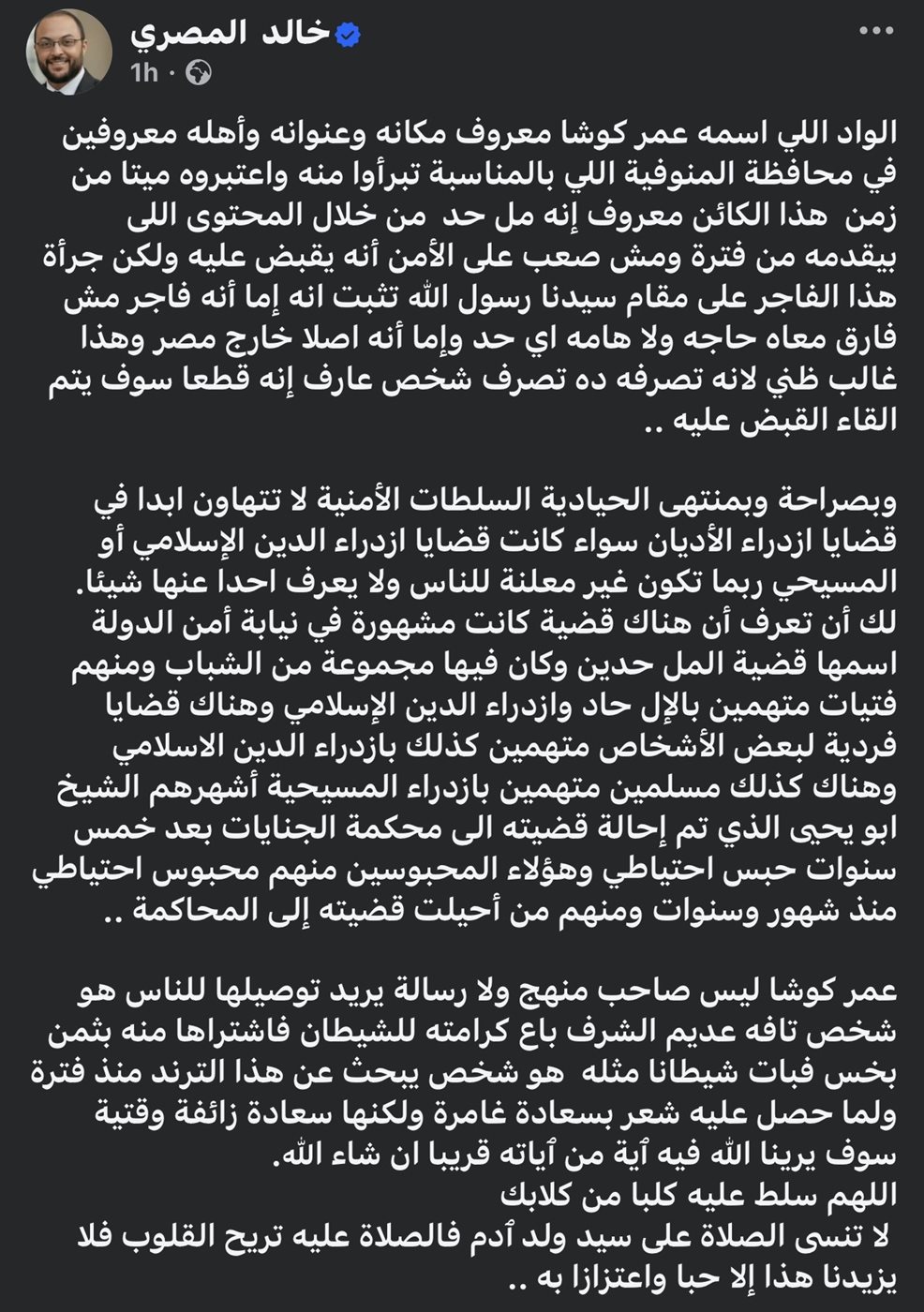 قال المحامي: “الواد اللي اسمه عمر كوشا معروف مكانه وعنوانه وأهله معروفون في محافظة المنوفية اللي بالمناسبة تبرأوا منه واعتبروه ميتًا من زمن هذا الكائن معروف إنه ملحد من خلال المحتوى اللى بيقدمه من فترة ومش صعب على الأمن أنه يقبض عليه ولكن جرأة هذا الفاجر على مقام سيدنا رسول الله تثبت أنه إما أنه فاجر مش فارق معاه حاجة ولا هامه أي حد، وإما أنه أصلًا خارج مصر، وهذا غالب ظني، لأن تصرفه ده تصرف شخص عارف إنه قطعًا سوف يتم إلقاء القبض عليه”.