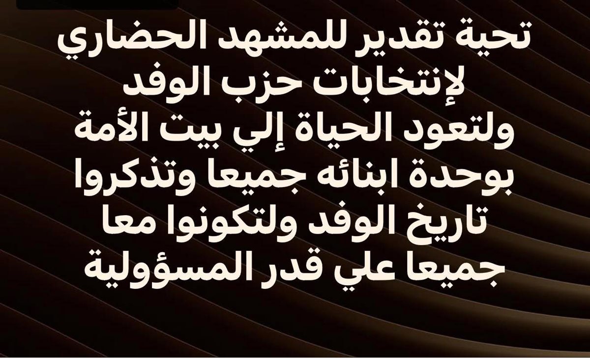 وقال خالد أبو بكر: تحية تقدير للمشهد الحضاري لإنتخابات حزب الوفد ولتعود الحياة إلي بيت الأمة بوحدة أبنائه جميعًا".