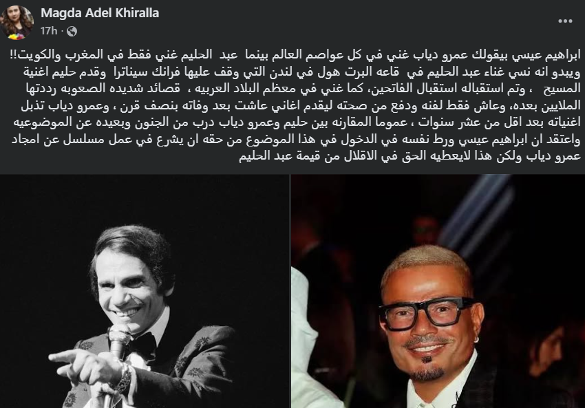 كتبت ماجدة خير الله: “ابراهيم عيسي بيقولك عمرو دياب غني في كل عواصم العالم بينما عبد الحليم غني فقط في المغرب والكويت!! ويبدو انه نسي غناء عبد الحليم في قاعه البرت هول في لندن التي وقف عليها فرانك سيناترا وقدم حليم اغنية المسيح، وتم استقباله استقبال الفاتحين”.