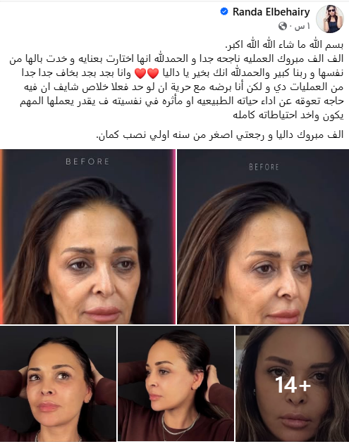 وتابعت:" وانا بجد بجد بخاف جدا جدا من العمليات دي و لكن أنا برضه مع حرية ان لو حد فعلا خلاص شايف ان فيه حاجه تعوقه عن اداء حياته الطبيعيه او مأثره في نفسيته ف يقدر يعملها المهم يكون واخد احتياطاته كامله..الف مبروك داليا و رجعتي اصغر من سنه اولي نصب كمان".