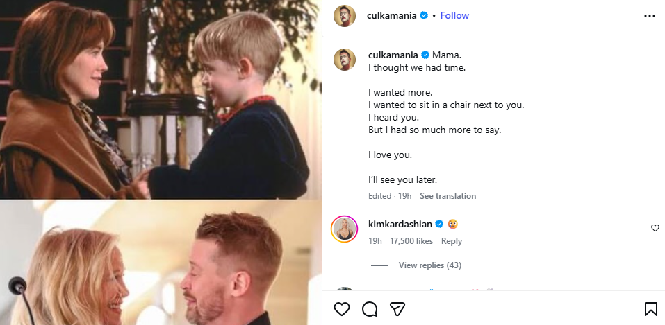 ونشر الممثل رسالة حزينة عبر حسابه على إنستجرام عقب إعلان وفاتها عن عمر ناهز واحداً وسبعين عاماً، ووجّه كولكين كلماته إليها بصيغة شخصية حميمة مخاطباً إياها بلقب ماما في إشارة إلى العلاقة العميقة التي جمعتهما.