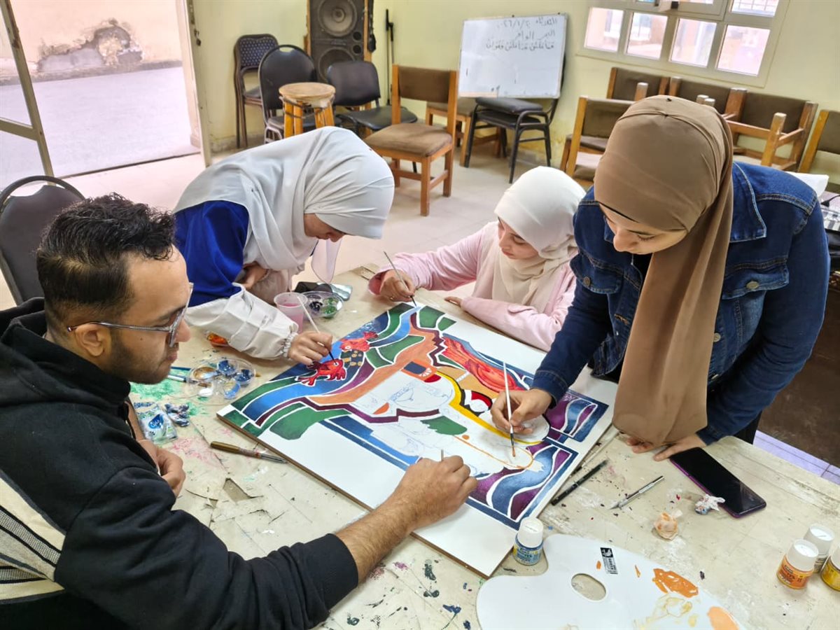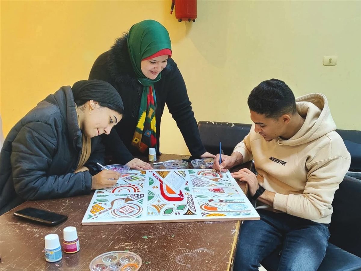 ويواصل المتدربون العمل على تلوين تصميمات فنية مستوحاة من طبيعة محافظة الفيوم ومعالمها المميزة، حيث تضمنت الأعمال بيوت قرية تونس وأبراج الحمام، إلى جانب الزخارف التراثية بألوانها المبهجة.