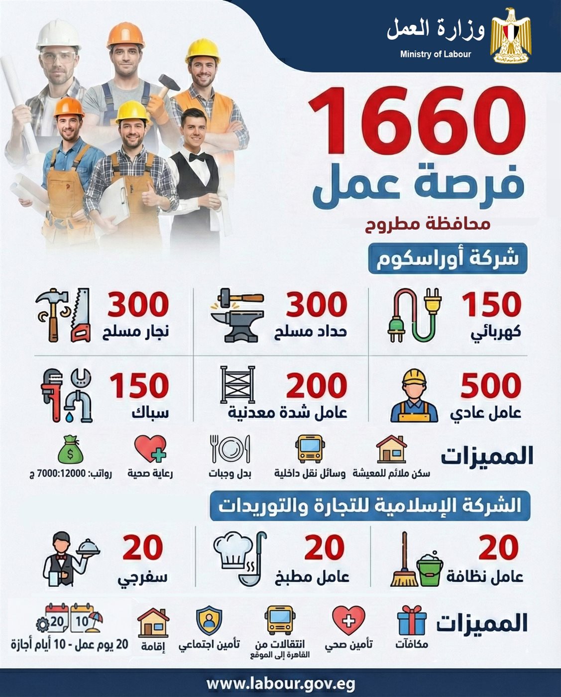أعلنت وزارة العمل، بالتعاون مع مديرية عمل مطروح، عن توافر عدد 1660 فرصة عمل في مجالات متعددة للعمل بشركتي أوراسكوم والشركة الإسلامية للتجارة والتوريدات، وذلك في إطار تنفيذ توجيهات وزير العمل محمد جبران، بتوفير فرص عمل لائقة للشباب ودعم سوق العمل.