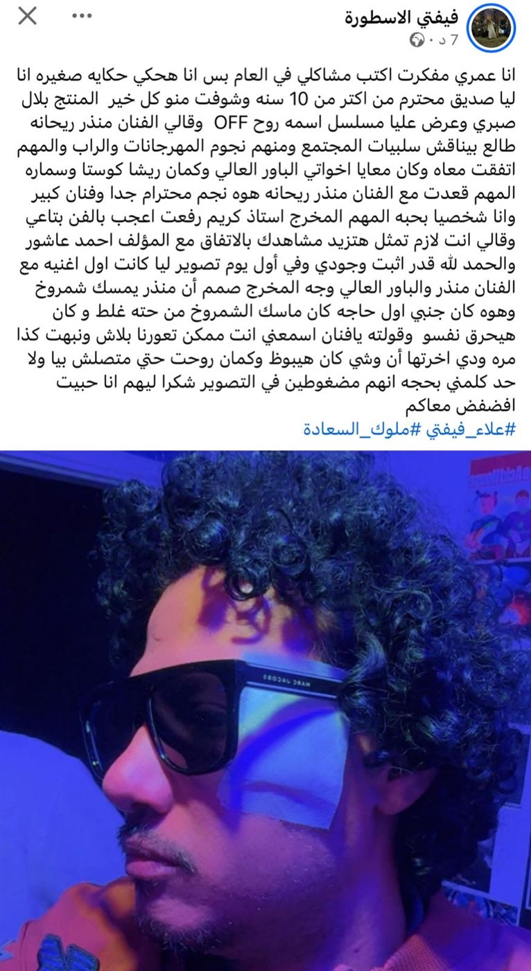 وأشار علاء فيفتي أن الموقف كاد أن يتسبب في تشوه بوجهه، على حد وصفه، مشيرًا إلى أنه غادر موقع التصوير عقب الواقعة، قبل أن يفاجأ بعدم تلقي أي تواصل لاحق من فريق العمل، مبررًا ذلك بما قيل له عن ضغط التصوير، مختتمًا منشوره بالتأكيد على أنه أراد فقط الفضفضة ومشاركة ما حدث معه.
