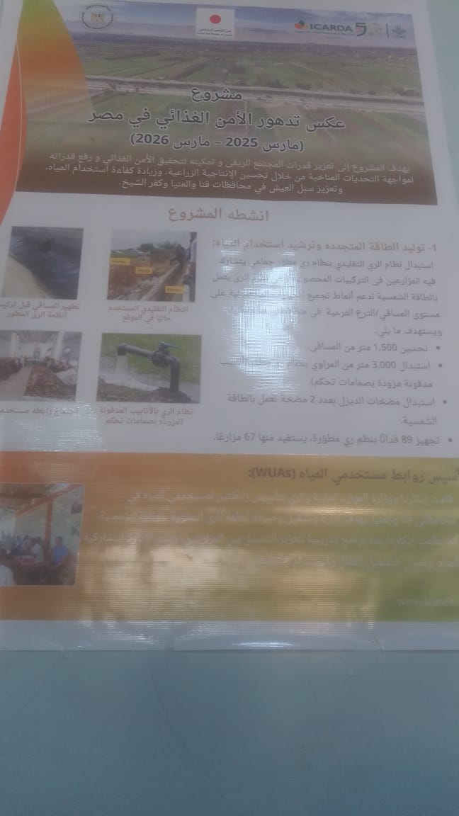 كما تناول المهندس إبراهيم بغدادى وكيل وزارة الموارد المائية والرى بمحافظة قـــنا؛ خلال كلمته بمضيفة آل المرابط في قرية الأشراف؛ التعاون المثمر مع اليابانيين في تطبيق مشروع إيكاردا وتأسيس روابط مستخدمى المياه؛ لإدارة وتشغيل أنظمة الرى المطورة بالطاقة الشمسية.