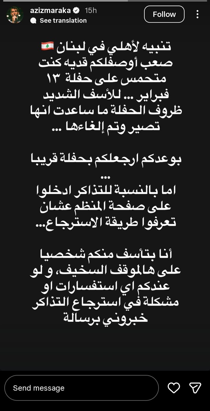 ونشر عزيز مرقة بيانًا عبر حسابه الرسمي على موقع إنستجرام، عبر فيه عن حزنه لعدم لقائه جمهوره في لبنان، مؤكدًا أنه كان متحمسًا للحفل، إلا أن الظروف لم تسمح بإقامته.