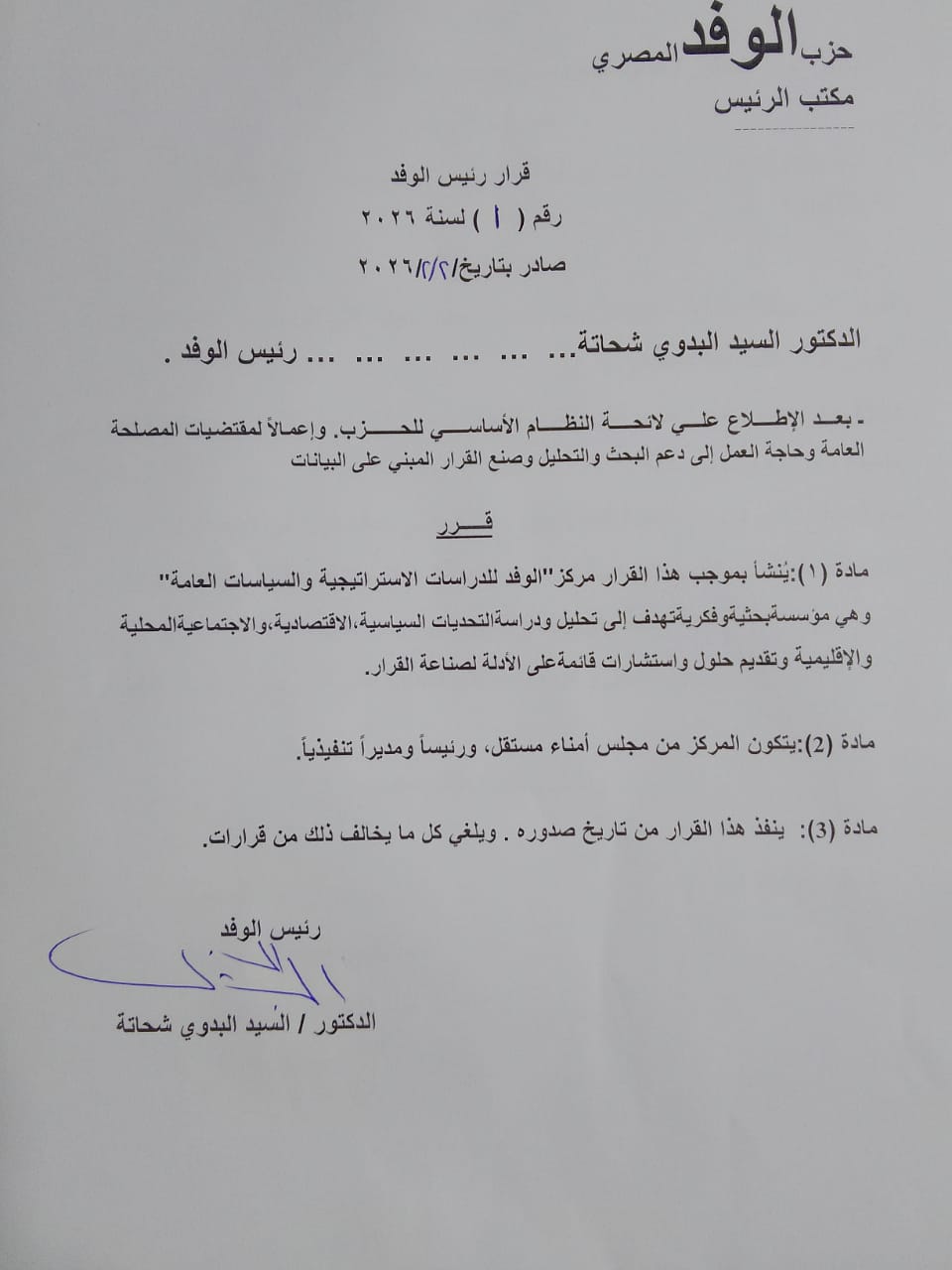 أصدر الدكتور السيد البدوي شحاتة رئيس حزب الوفد قرارا حمل رقم ١ لسنة ٢٠٢٦، بإنشاء مركز الوفد للدراسات الاستراتيجية والسياسات العامة، إعمالا لمقتضيات المصلحة العامة وحاجة العمل إلى دعم البحث والتحليل وصنع القرار المبنى على البيانات .