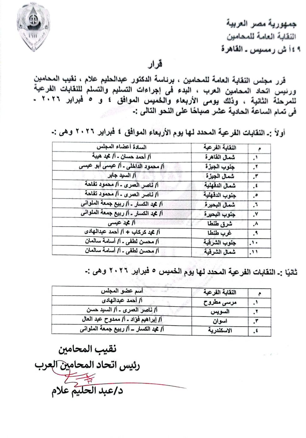 قرر مجلس النقابة العامة للمحامين، برئاسة الدكتور عبد الحليم علام، نقيب المحامين ورئيس اتحاد المحامين العرب، البدء في إجراءات التسليم والتسلم للنقابات الفرعية للمرحلة الثانية، وذلك يومي الأربعاء والخميس الموافقين 4 و5 فبراير 2026، في تمام الساعة الحادية عشرة صباحًا.