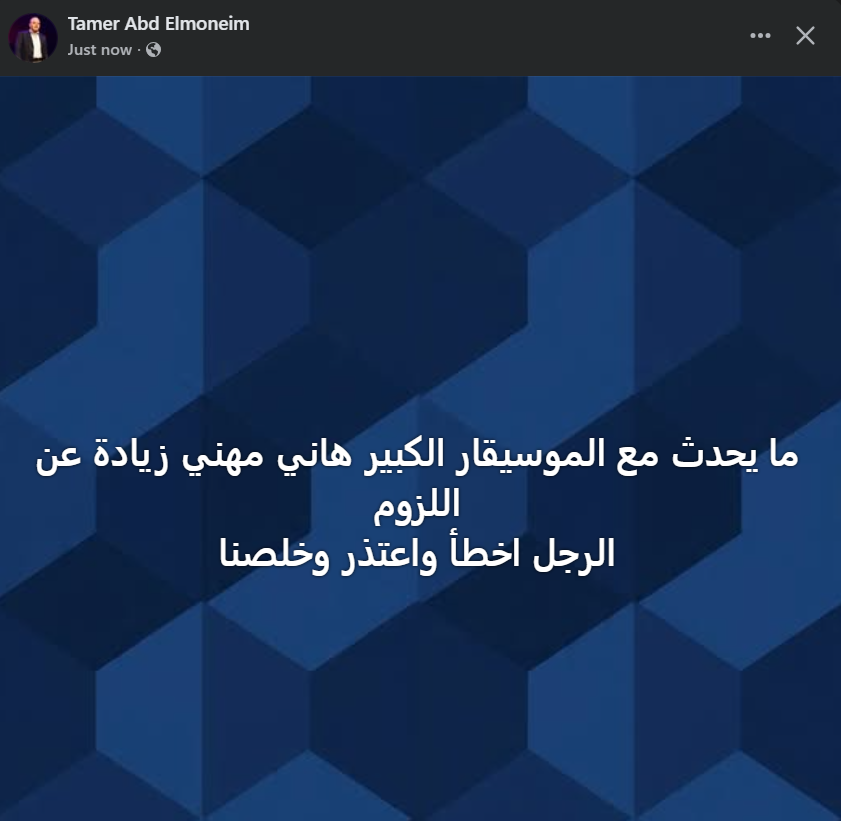 وكتب تامر عبدالمنعم: ما يحدث مع الموسيقار الكبير هاني مهنا زيادة عن اللزوم … الرجل اخطأ واعتذر وخلصنا"، وذلك خلال منشور عبر حسابه الشخصي بموقع التواصل الإجتماعي الأشهر “فيس بوك”.