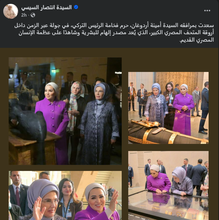 أعربت السيدة انتصار السيسي قرينة رئيس الجمهورية عبد الفتاح السيسي، عن بالغ سعادتها وامتنانها بمرافقة السيدة أمينة أردوغان، حرم الرئيس التركي رجب طيب أردوغان ، في جولة عبر الزمن داخل أروقة المتحف المصري الكبير، وذلك خلال منشور عبر حسابها الرسمي على موقع التواصل الإجتماعي الأشهر “فيسبوك”.