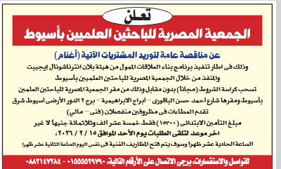 الجمعية المصرية للباحثين العلميين بأسيوط تعلن عن مناقصة عامة لتوريد المشتريات الاتية "أغنام" الخميس 05/فبراير/2026 - 12:18 م 2/5/2026 12:18:02 PM تابعوا آخر أخبار بوابة الوفد الإلكترونية عبر Google News