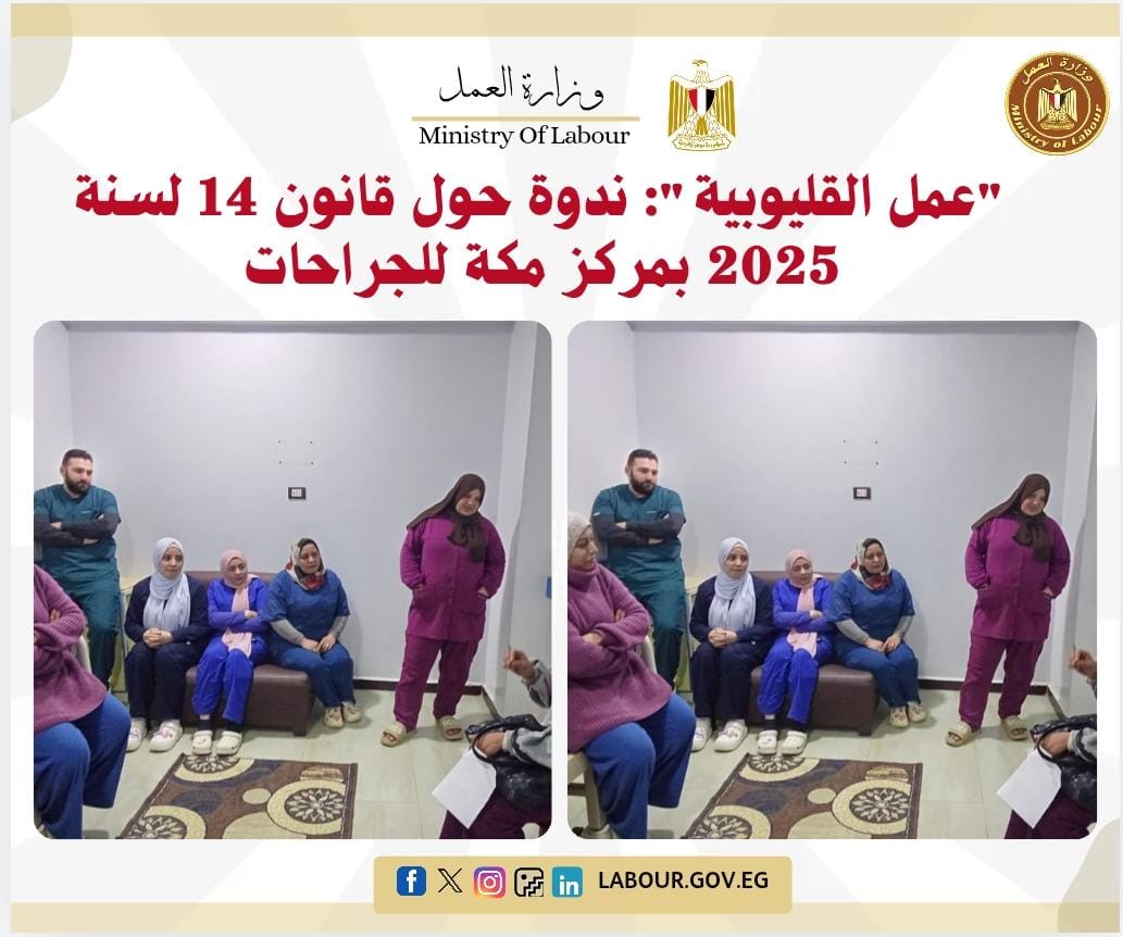 أعلن فوزي صابر، وكيل وزارة العمل بالقليوبية، عقد ندوة تثقيفية بمركز مكة للجراحات بشبين القناطر، تناولت شرحاً تفصيلياً لأحكام القانون الجديد، مع التركيز على عقود العمل، الإجازات، وحقوق النساء والأطفال وذوي الهمم، لتعزيز مناخ العمل اللائق وتحفيز الاستثمار.