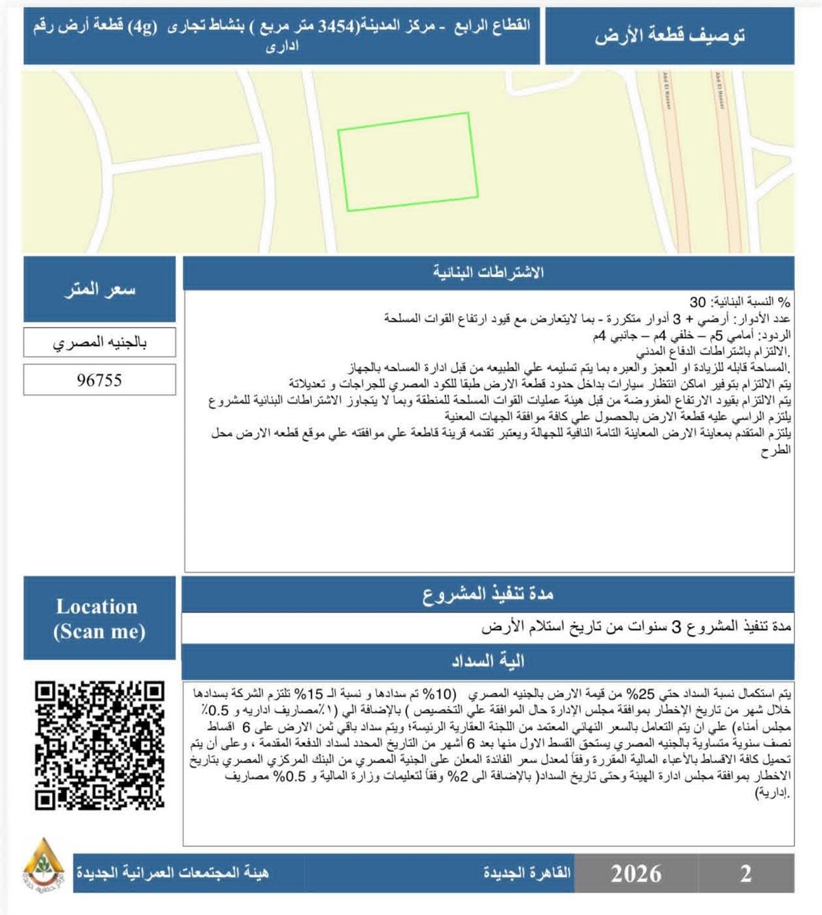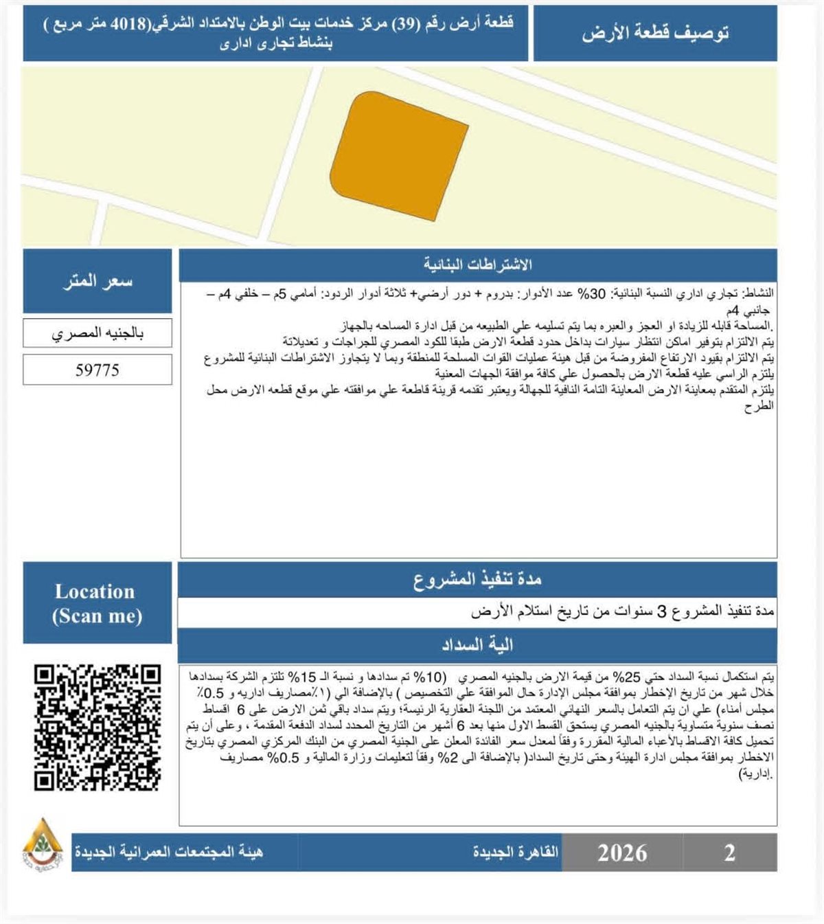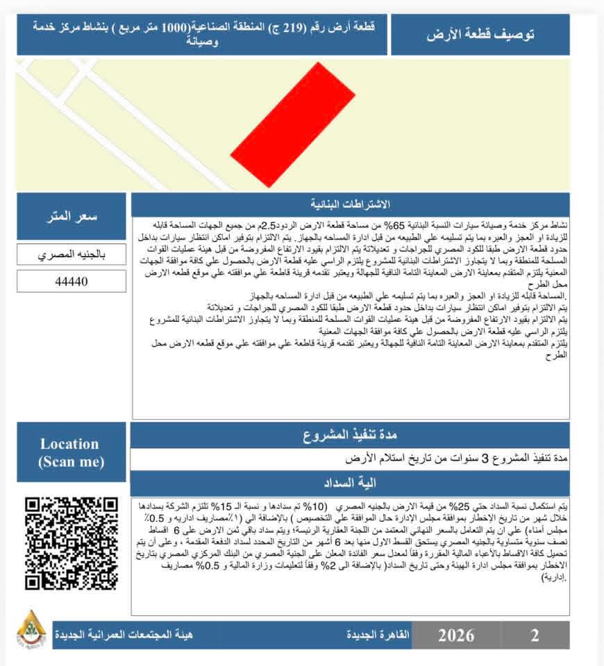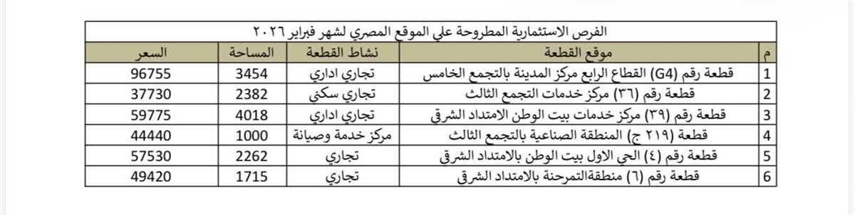 وأشار المهندس أحمد رشاد الشريف إلى أن الفرص المطروحة لشهر فبراير 2026 تشمل قطعًا استثمارية بأنشطة متنوعة وفي مواقع متميزة بمختلف تجمعات المدينة، وفقًا للاتي: