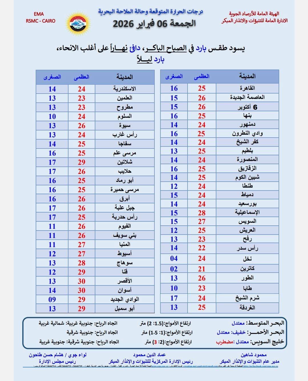 أما عن درجات الحرارة الصغرى والعظمى المتوقعة اليوم فجاءت كالتالي..