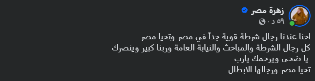 وأضافت في رسالتها كلمات دعم وتعاطف، دعت فيها للضحية بالرحمة، مؤكدة أن الله عادل ولن يضيع حق المظلوم، ومختتمة منشورها بالتأكيد على دعمها الكامل للدولة المصرية ورجالها، قائلة:«تحيا مصر ورجالها الأبطال».