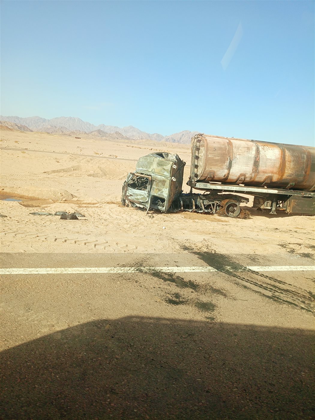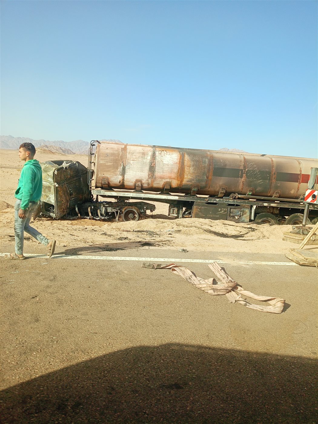 اندلعت نيران هائلة في سيارة محملة بمواد بترولية سريعة الاشتعال على الطريق الدولي بجنوب سيناء عقب اصطدام مروع بثلاث شاحنات نقل ثقيل حول المنطقة إلى ساحة من اللهب والدخان الكثيف.