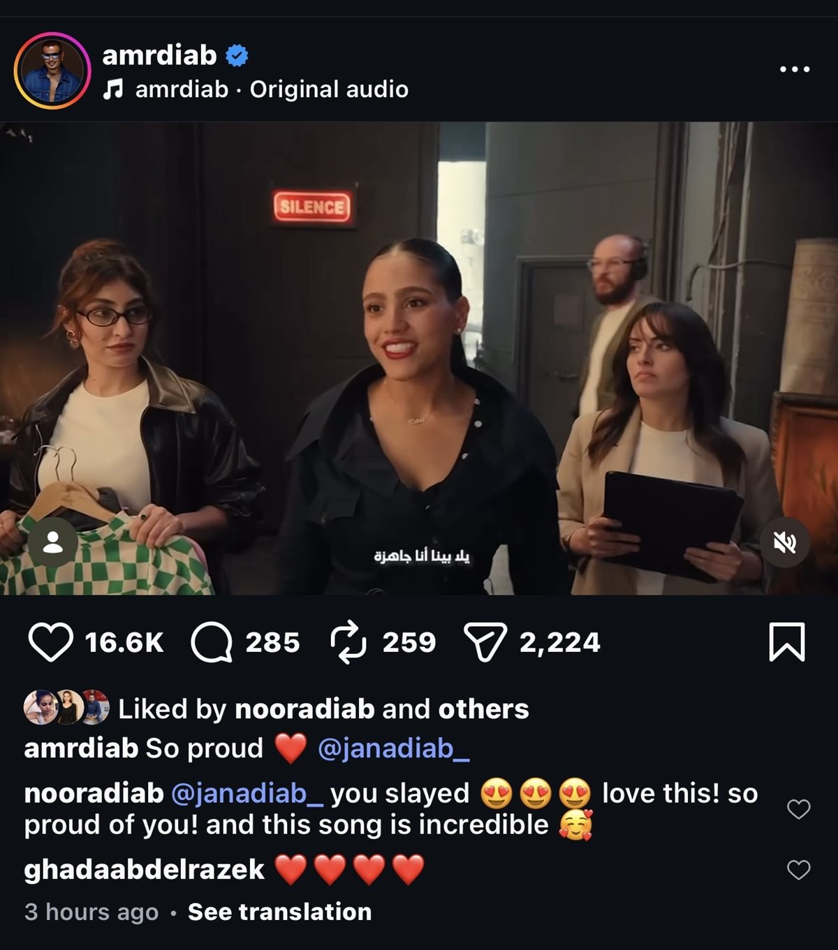 نشر عمرو دياب إعلان ابنته جنا، وأرفقه بتعليق قائلًا: "فخور جدًا"، وذلك خلال منشور عبر حسابه الشخصي بموقع تبادل الصور والفيديوهات “انستجرام”.