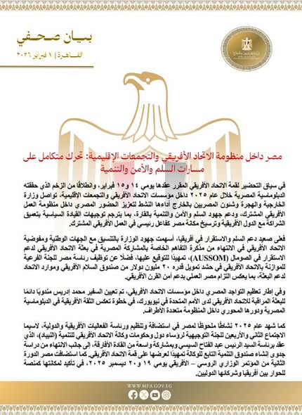 في سياق التحضير لقمة الاتحاد الأفريقي المقرر عقدها يومي ١٤ و ١٥ فبراير، وانطلاقا من الزخم الذي حققته الدبلوماسية المصرية خلال عام ۲۰٢٥ داخل مؤسسات الاتحاد الأفريقي والتجمعات الإقليمية، تواصل وزارة الخارجية والهجرة وشئون المصريين بالخارج أداءها النشط لتعزيز الحضور المصري داخل منظومة العمل الأفريقي المشترك، ودعم جهود السلم والأمن والتنمية بالقارة، بما يترجم توجيهات القيادة السياسية بتعميق الشراكة مع الدول الأفريقية وترسيخ مكانة مصر كفاعل رئيسي في العمل الأفريقي المشترك.