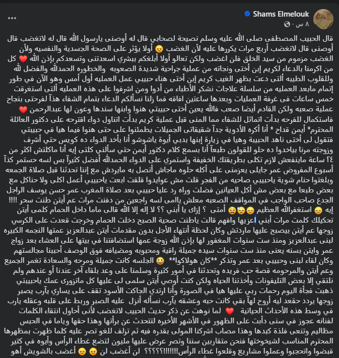 وكتبت شمس البارودي، عبر حسابها الرسمي على موقع التواصل الإجتماعي “فيسبوك”، أنها حرصت على ضبط النفس واستحضار حديث النبي ﷺ “لا تغضب” قائلة: "قال الحبيب المصطفى صلى الله عليه وسلم نصيحة لصحابي قال له أوصنى يارسول الله قال له لاتغضب قال أوصنى قال لاتغضب أربع مرات يكررها عليه لأن الغضب".