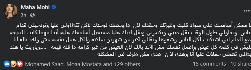 وكتبت مها نصار: “أنا ممكن أسامحك علي سواد قلبك وغيرتك وحقدك لان دا يخصك لوحدك لاكن تتطاولي عليا وتردحيلي قدام الناس وتحاولي طول الوقت تقل منيي وتكسرني وتقل ادبك عليا مستحيل أسامحك عليه أبدا مهما كانت النتيجه”.