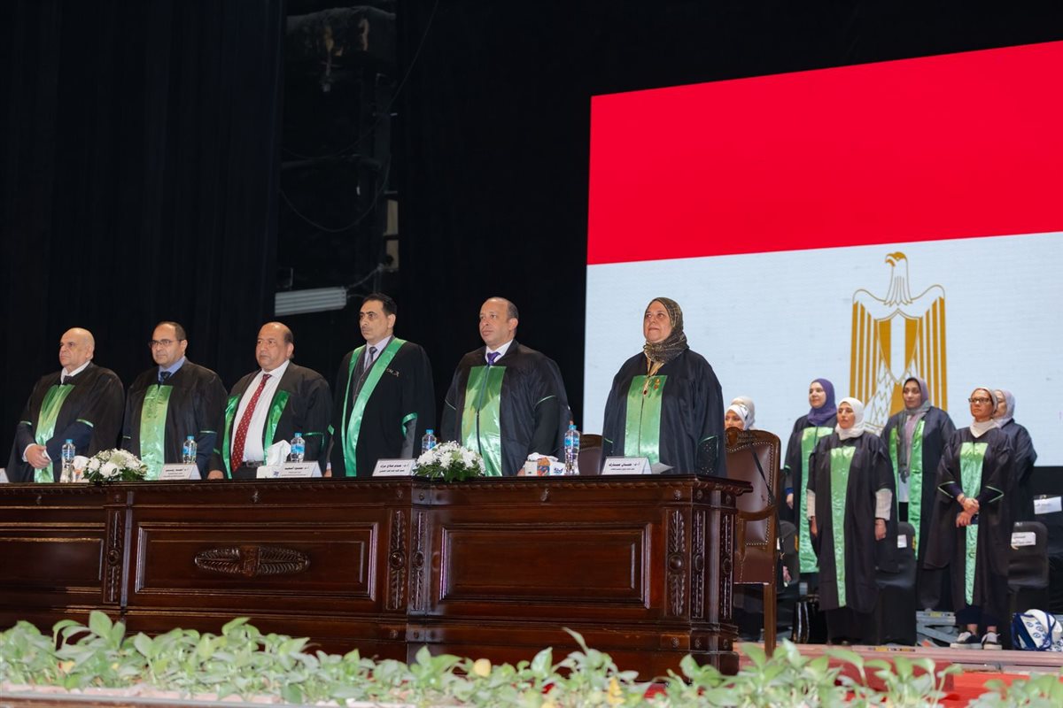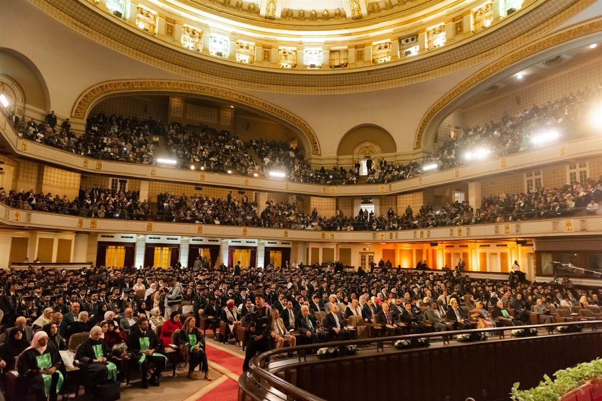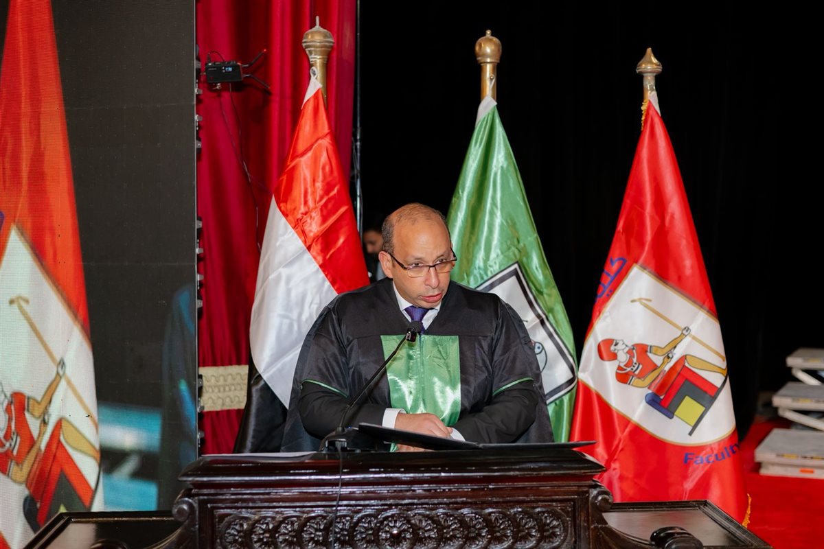 جاء ذلك تحت رعاية الدكتور محمد سامي عبد الصادق رئيس الجامعة وحضور الدكتور محمود السعيد نائب رئيس الجامعة للدراسات العليا والبحوث، والدكتور أحمد رجب نائب رئيس الجامعة لشئون التعليم والطلاب، والدكتور حسام صلاح عميد الكلية، ووكلاء الكلية، وعدد من سفراء وممثلي الدول العربية والإفريقية، ولفيف من أعضاء هيئة التدريس، والخريجين وأسرهم.