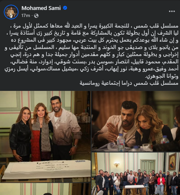 أعلن المخرج محمد سامي عن خوض تجربة التمثيل لأول مرة أمام النجمة يسرا في مسلسله الجديد “قلب شمس”، وذلك خلال منشور عبر حسابه الشخصي بموقع التواصل الإجتماعي الأشهر “فيس بوك”.