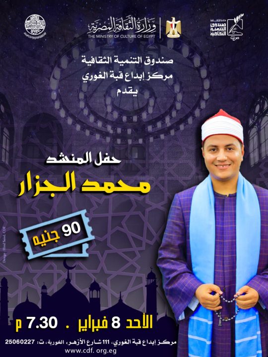 يستضيف مركز إبداع قبة الغوري بحي الأزهر – التابع لصندوق التنمية الثقافية، يوم الأحد الموافق 8 فبراير 2026، حفلًا للمنشد محمد الجزار، في تمام الساعة السابعة والنصف مساءً.
