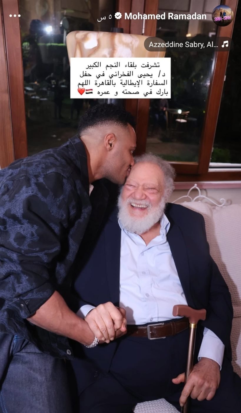 ونشر محمد رمضان صورة تجمعه بالفنان يحيى الفخراني من خلال خاصية الاستوري على حسابه بموقع إنستجرام، وعلق عليها قائلًا: "تشرفت بلقاء النجم الكبير د. يحيى الفخراني في حفل السفارة الإيطالية بالقاهرة، اللهم بارك في صحته وعمره".