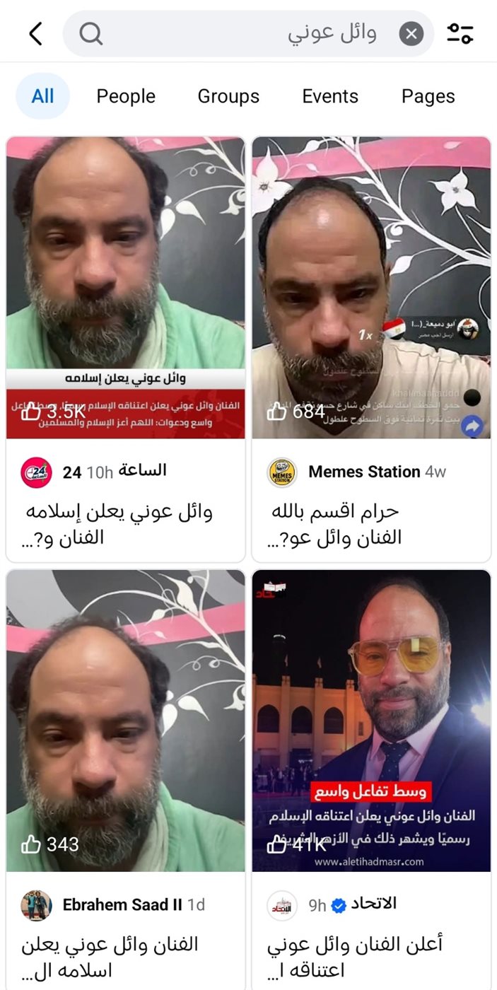 تصدر الفنان وائل عوني مؤشرات البحث على مواقع التواصل الاجتماعي بعد انتشار شائعات حول اعتناقه للدين الإسلامي، إلا أن الأخبار المتداولة لا صحة لها، فيما اكتفى وائل بالتعليق عليها بطريقة ساخرة عبر حسابه على فيسبوك.
