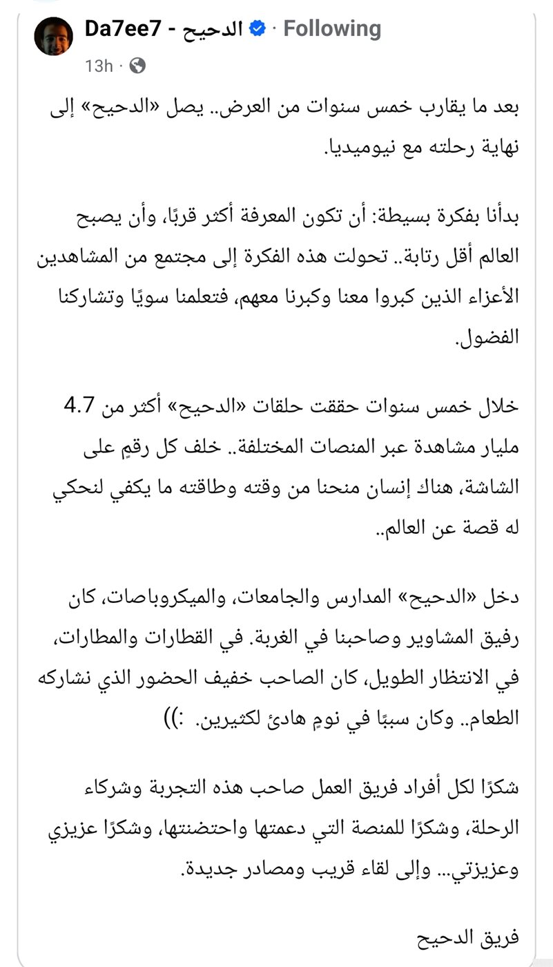 أعلن صانع المحتوى المعروف بأسم الدحيح عن انتهاء رحلته مع منصة نيوميديا بعد ما يقارب خمس سنوات من النجاح المستمر، مؤكّدًا أن هذا الفصل يمثل نهاية تجربة مميزة وبداية لآفاق جديدة في مسيرته.