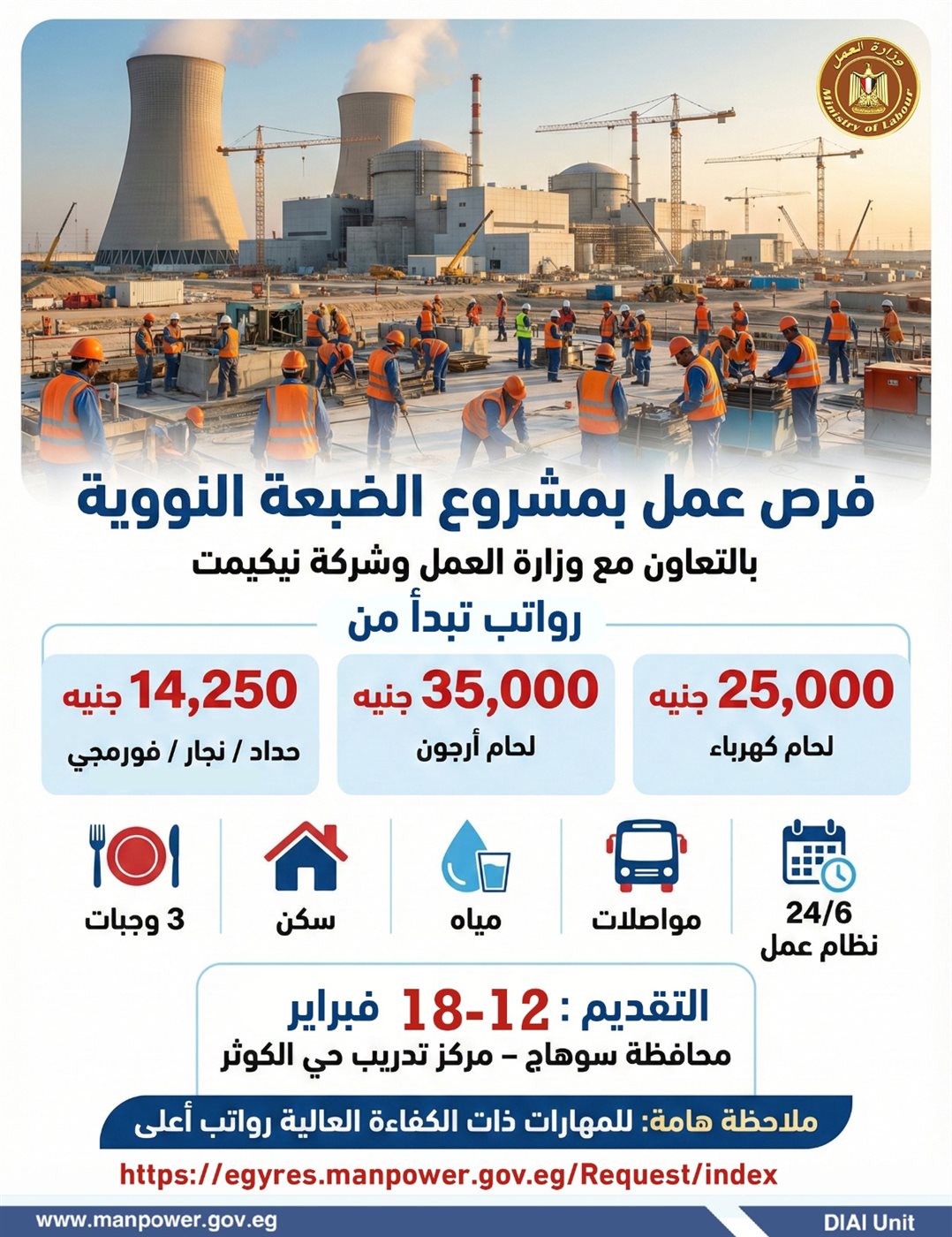 أعلنت وزارة العمل، بالتعاون مع شركة «نيكيمت» إحدى شركات مشروع الضبعة النووية، عن فتح باب التقديم والاختبارات لشغل عدد من فرص العمل الفنية بالمشروع، وذلك بمحافظة سوهاج خلال الفترة من يوم الخميس 12 فبراير 2026 وحتى يوم الأربعاء 18 فبراير 2026، باستثناء يومي الجمعة والسبت، ويمكن التقديم مباشرة بمقر مركز تدريب سوهاج – حي الكوثر – امتداد شارع مكتب البريد، وذلك في إطار دعم الدولة للتشغيل وتوفير فرص عمل حقيقية ومستقرة للشباب المصري.
