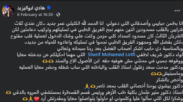 وأضاف: “لكن بفضل الله ومجهود الفريق الطبي نجحوا في تسليكه واعادوه للحياة من جديد، وبالمناسبة دي حابب اشكر أصحاب الفضل بعد ربنا سبحانه وتعالي لواء دكتور شريف لطفي اللي مهما احكيلكم عن جدعنته معايا ووقوفه جمبي في محنتي مش هوفيه حقه ابن الأصول الاخ والسند، ودكتور مدحت سعد زغلول استاذ القلب والباطنة اللي ساب شغله وحضر معايا العملية وماسبنيش”.