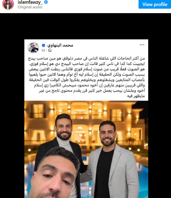 وفي تطور جديد، خرج شاب يدعى محمد البنهاوي، ليكشف بحسب قوله عن هوية صاحب الصفحة، مؤكدًا أنه شقيق إسلام فوزي التوأم، موضحًا أن تشابه الصوت كان السبب الرئيسي وراء ربط المتابعين بين الصفحة وإسلام فوزي.