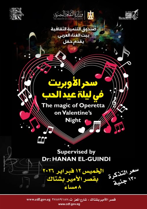 يقيم مركز إبداع قصر الأمير بشتاك بشارع المعز التابع لصندوق التنمية الثقافية، بعد غد الخميس الموافق 12 فبراير 2026، حفل “سحر الأوبريت” في ليلة عيد الحب، وذلك في تمام الساعة الثامنة مساءً، بقيادة الدكتورة حنان الجندي.