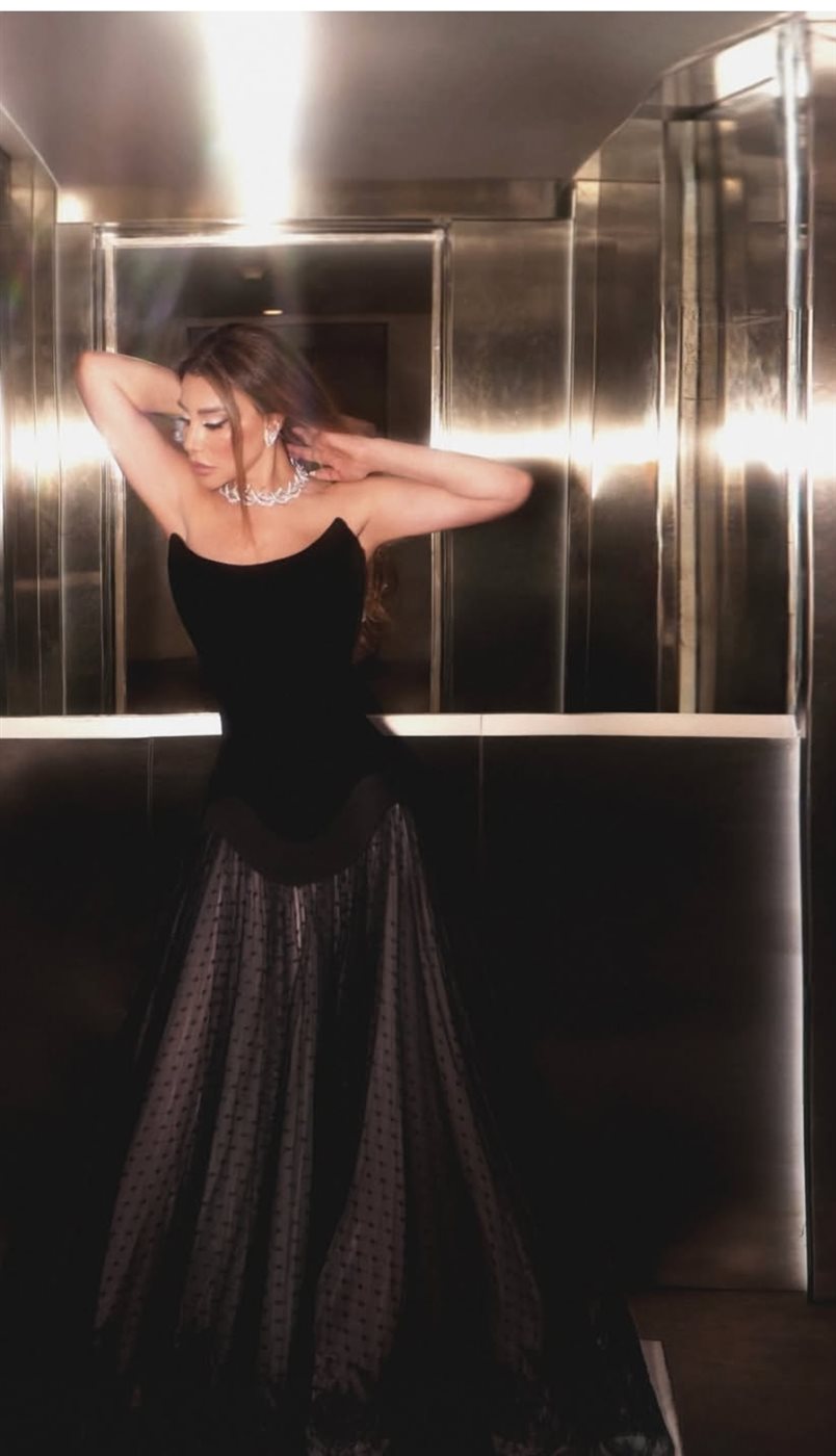 وتألقت نجوى كرم بإطلالة ساحرة مواكبة لأحدث صيحات موضة فساتين خريف و شتاء 2025. 2026، حيث ارتدت فستان طويل ينتمي لقصة الكب مع الكورسية المصمم من المخمل باللون الأسود وتميز الجزء السفلي من الفستان بقماش التل المرزكش وتزينت ببعض المجوهرات المرصعة بالألماس.