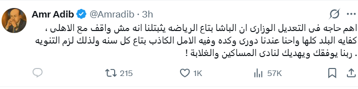 وجه الإعلامي عمرو أديب رسالة خاصة لوزير الرياضة الجديد جوهر نبيل، بعد ساعات قليلة من توليه حقبة وزارة الرياضة بدلًا من الوزير السابق د. أشرف صبحي، وذلك خلال تغريدة عبر حسابه الشخصي بمنصة التغريدات المصغرة “إكس”.