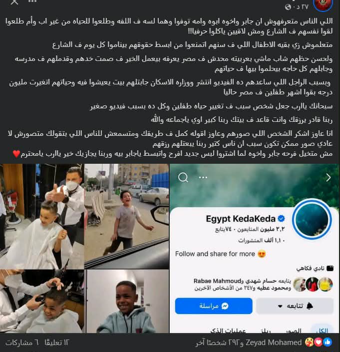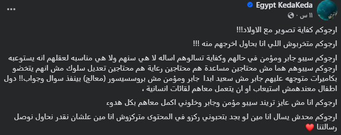 وجاء في المنشور: "ارجوكم كفاية تصوير مع الأولاد… متخربوش اللي أنا بحاول أخرجهم منه… سيبوا جابر ومؤمن في حالهم." .
