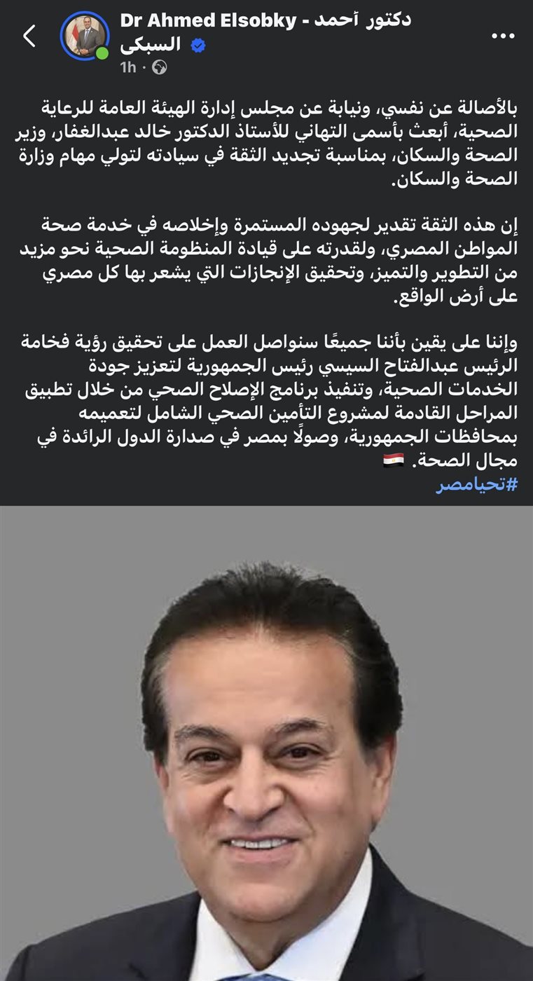 قال الدكتور أحمد السبكي: “بالأصالة عن نفسي، ونيابة عن مجلس إدارة الهيئة العامة للرعاية الصحية، أبعث بأسمى التهاني للأستاذ الدكتور خالد عبدالغفار، وزير الصحة والسكان، بمناسبة تجديد الثقة في سيادته لتولي مهام وزارة الصحة والسكان”.