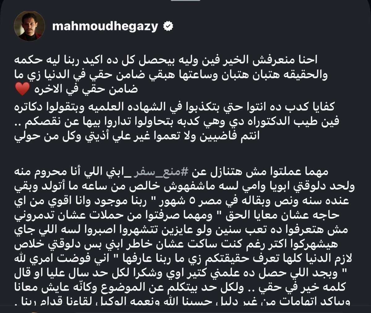 محمود حجازي لزوجته: مهما عملتوا مش هتنازل عن منع سفر ابني