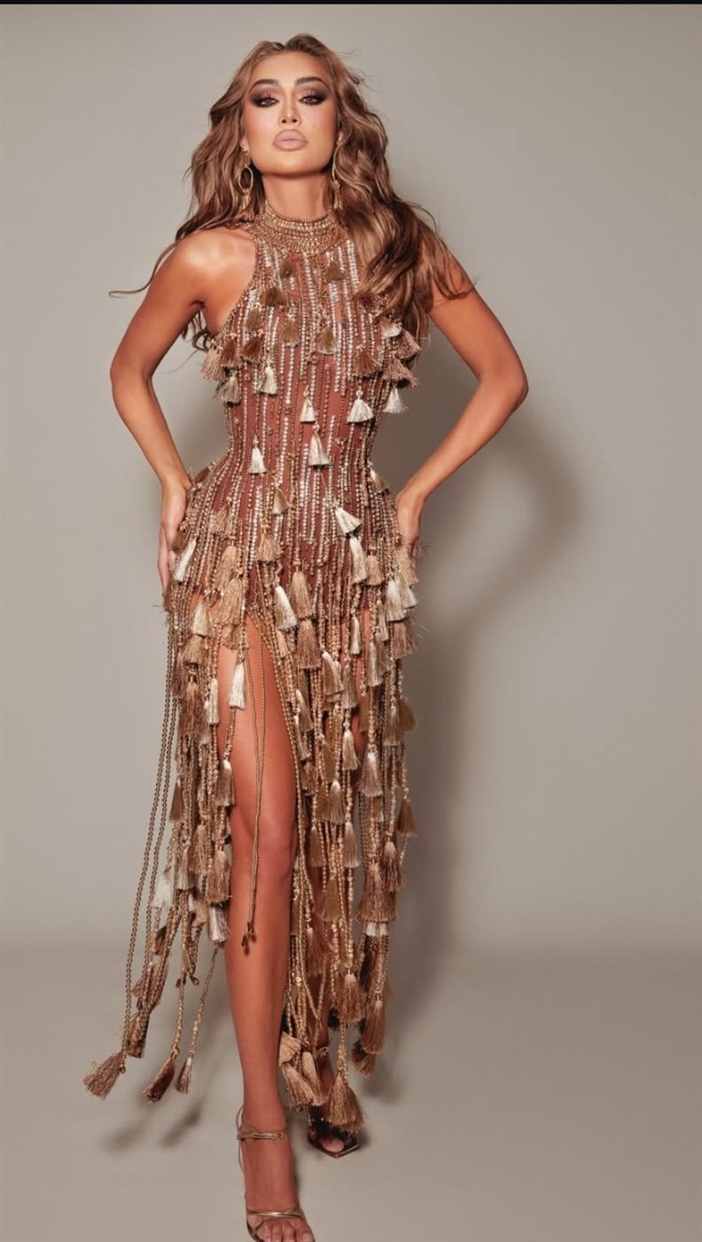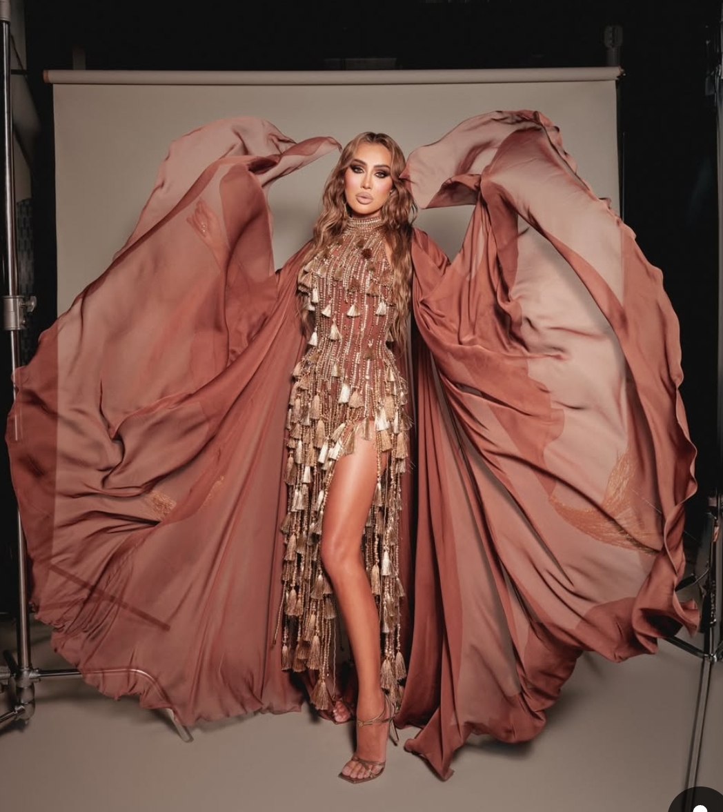 وبدت مايا دياب بإطلالة ساحرة، مزجت بين الأنوثة و الجرأة في آن واحد، حيث أرتدت فستان طويل مجسم، بلياقة عالية، صمم من قماش التل المطرز بالشراشيب الناعم باللون الطوبي مع الحرير ، مواكبة لأحدث صيحات موضة فساتين 2026، الفستان عكس قوامها الرشيق ووزنها المثالي بأسلوب جرئ يحبس الأنفاس.